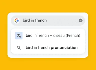 Get instant results when you ask to translate words or short phrases by typing “[Word] in [Language]”.
