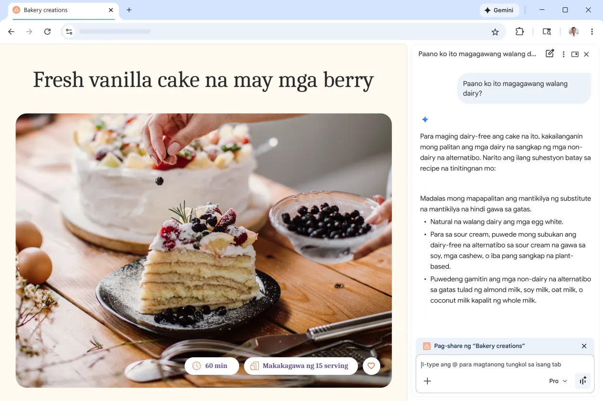 Nasa computer ka man o telepono, magagamit mo ang Gemini sa Chrome para magtanong, maghambing ng impormasyon, at makakuha ng mas mabilisang tulong sa mga nakabukas na tab sa iyong browser.