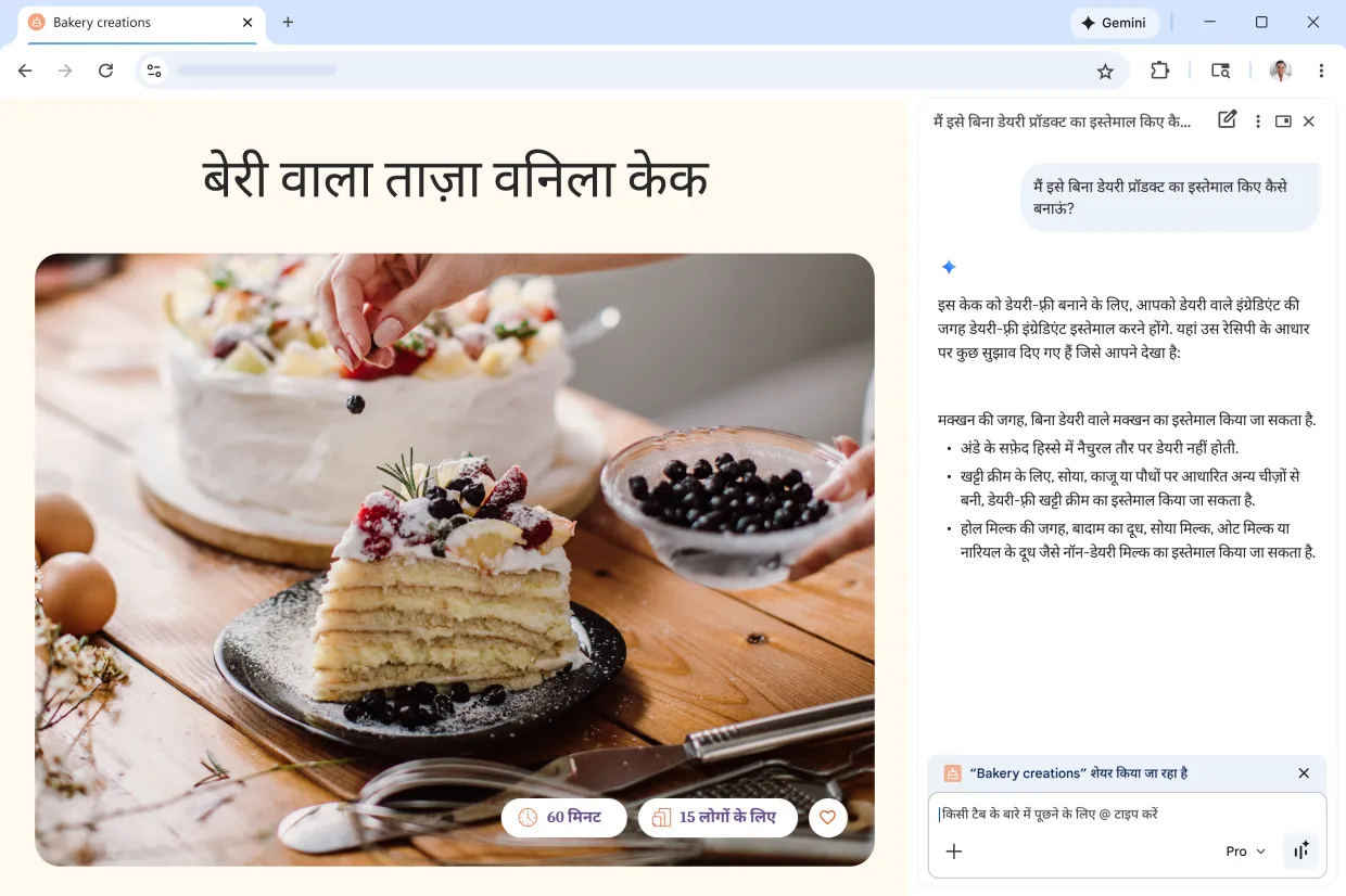 चाहे कंप्यूटर इस्तेमाल किया जा रहा हो या फ़ोन, 'Chrome में Gemini' का इस्तेमाल करके सवाल पूछे जा सकते हैं, जानकारी की तुलना की जा सकती है, और ब्राउज़र में खुले टैब में मौजूद कॉन्टेंट के बारे में तेज़ी से जानकारी हासिल की जा सकती है.