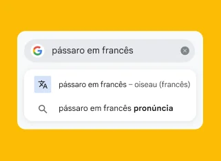 Receba resultados instantâneos ao pedir para traduzir palavras ou frases curtas. Basta digitar "[Palavra] em [idioma]".