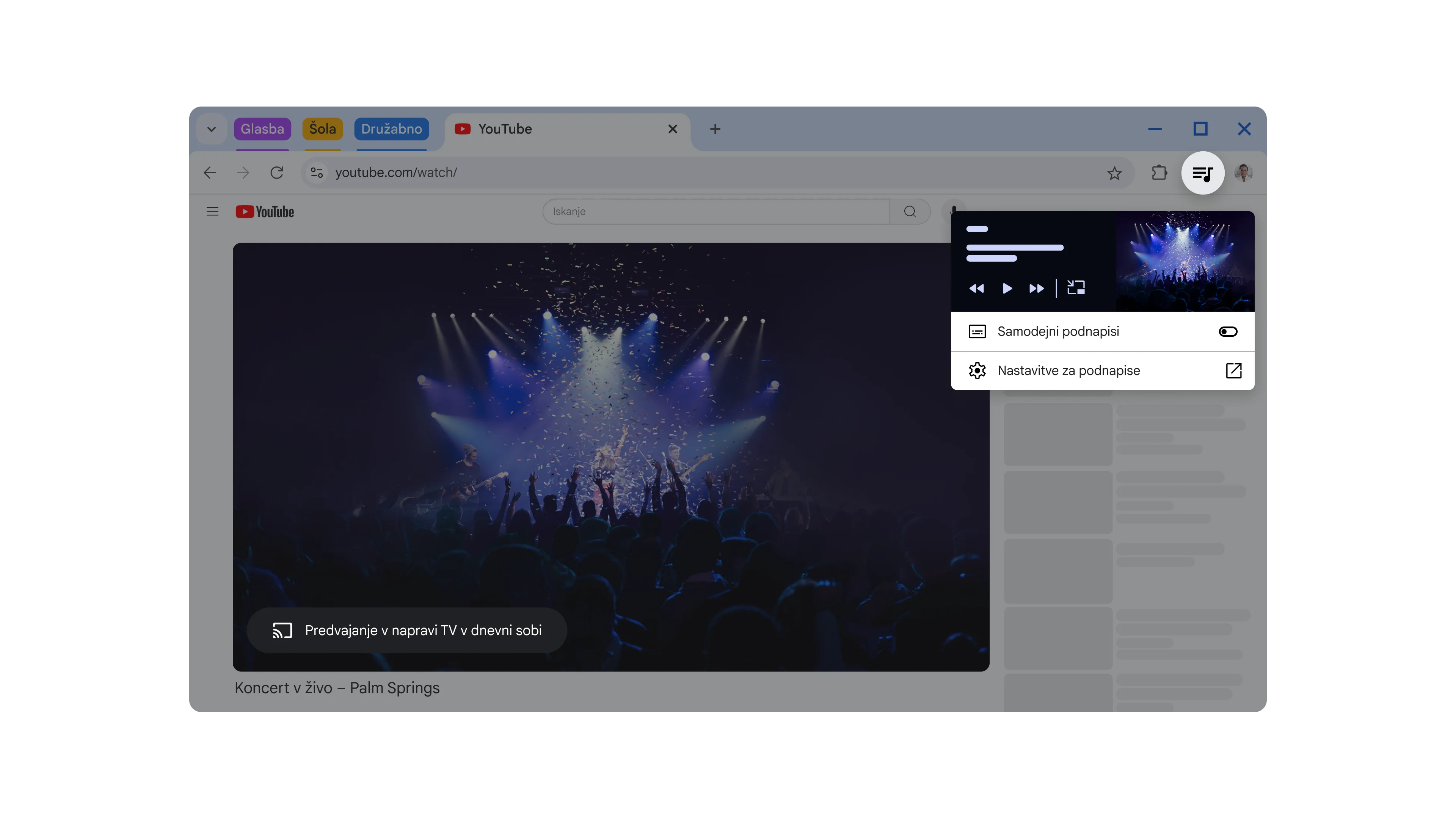 Chrome vam omogoča, da vsebino iz računalnika predvajate v telefonu ali televizorju, ki ima vgrajen Google Cast. Predvajate lahko vsebino na celotnem zaslonu ali samo na določenem zavihku.
